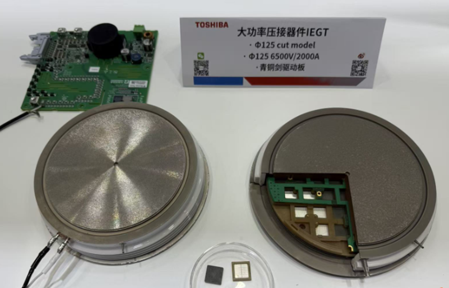 在东芝的传统优势领域——IEGT方面,本次展会重点展示了应用于柔性直流输配电(柔直)的高压压接式IEGT。这种器件采用独特的双面散热封装,上下铜板将芯片如三明治般压合在中间,散热性能极其优异。